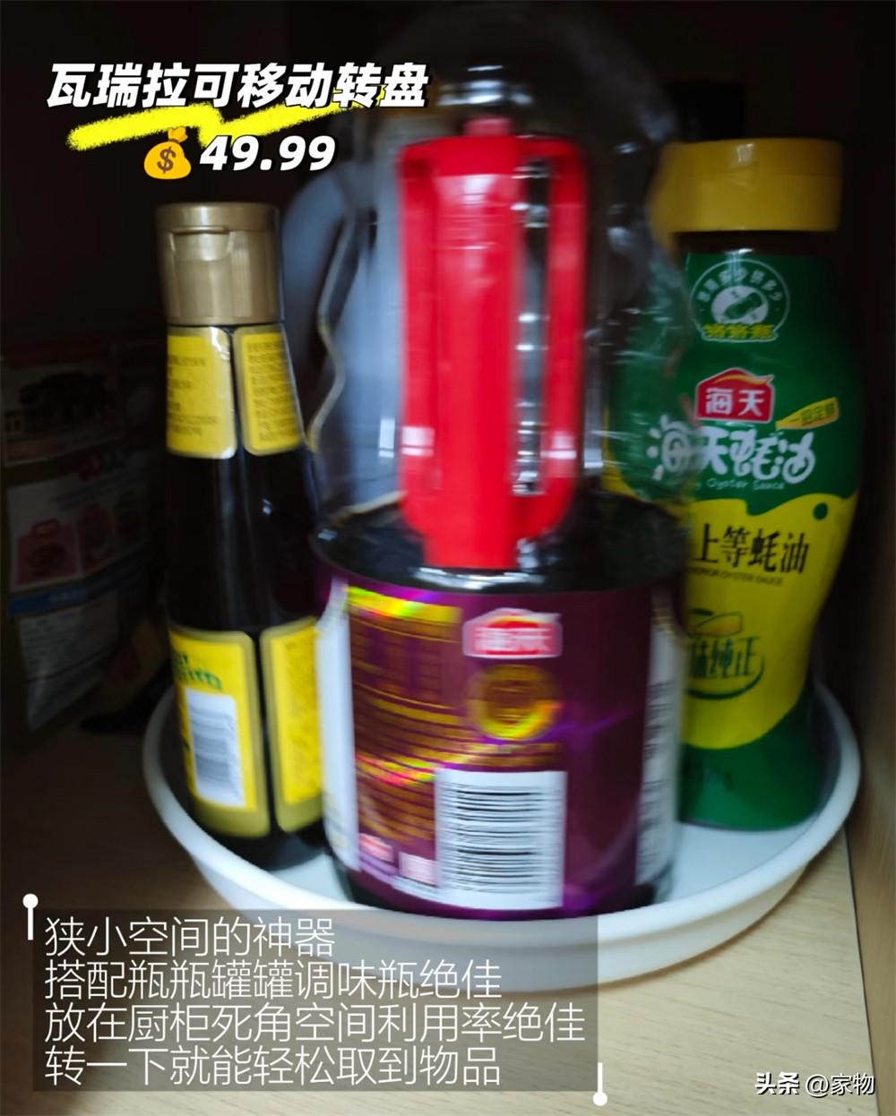 很多櫥櫃空間做得比較深,其實深度都有些浪費了,若你家也是的話,我強烈推薦你試試這種收納轉盤,放上瓶瓶罐罐以後,只要稍微旋轉就能啊拿取上面收納的物品,不用再伸着脖子去夠了,方便許多。
