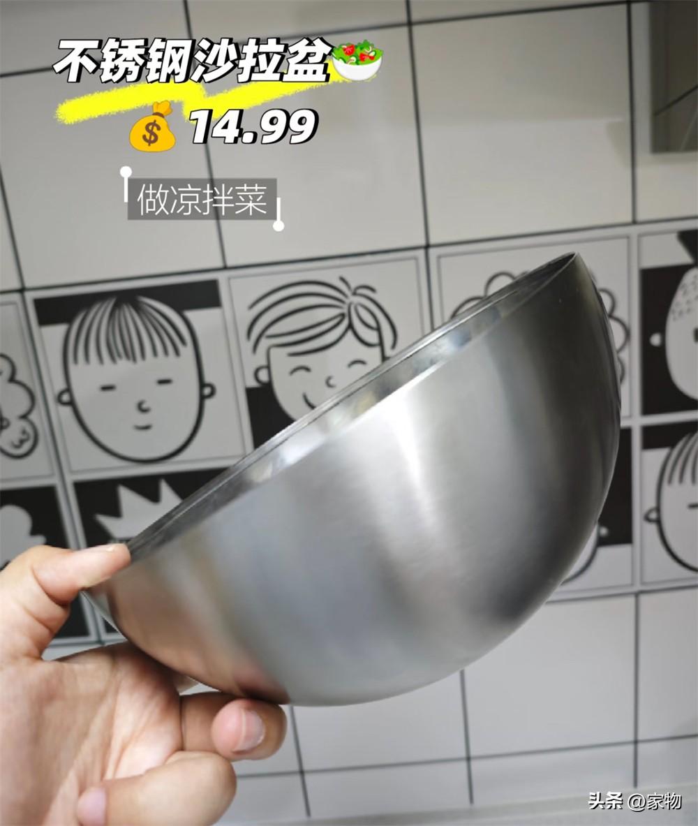 同樣是有不同尺寸的一個不鏽鋼碗,小號的這個用來做涼拌菜,當作餐碗使用都OK,而最大號的不鏽鋼沙拉盆,則可以洗菜、拌沙拉,外面是拉絲不鏽鋼材質,內壁是光滑的金屬材質,清潔打理超省心。