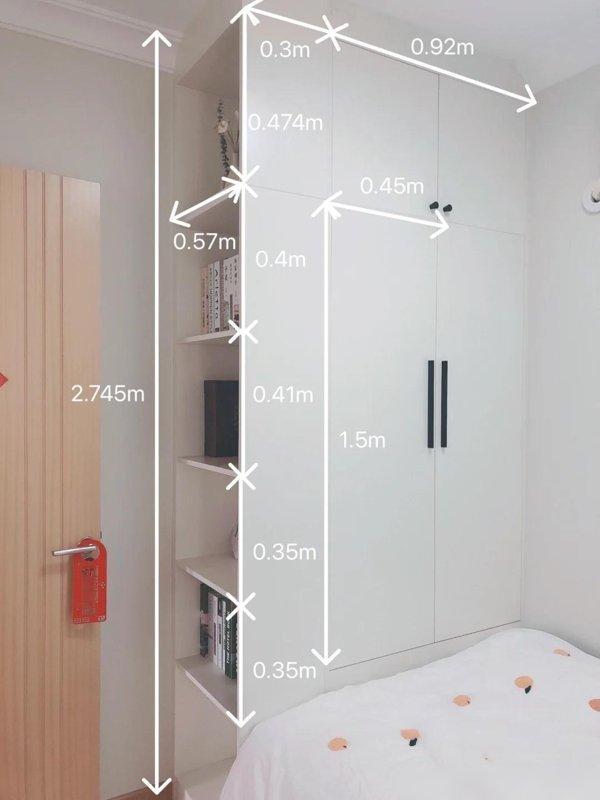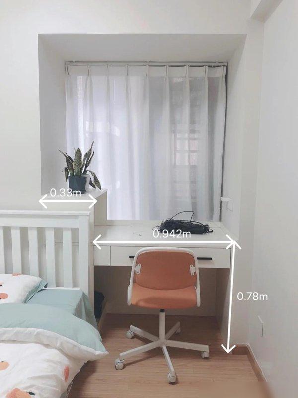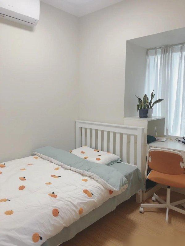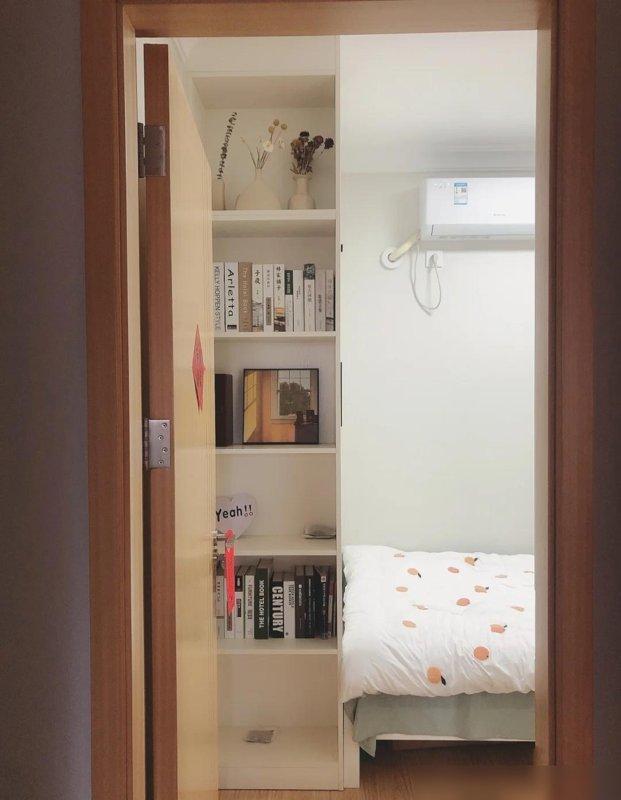 小次臥的杏子灰牆面,不是“莫蘭迪高級灰”的冷,是像咬開一口熟杏子的軟,單人牀靠牆放,留着空位給懸空書桌——不是“爲了裝學習區”硬塞的大桌子,而是剛好能放臺電腦、攤本書的大小,坐上去寫東西,背後是牆的安全感;衣櫃和書櫃做在一起,不是分開買的櫃子堆得房間擠,而是疊衣區、掛衣區、書架分層清清楚楚,放件毛衣、擺本舊書,都像在跟房間“對話”。
