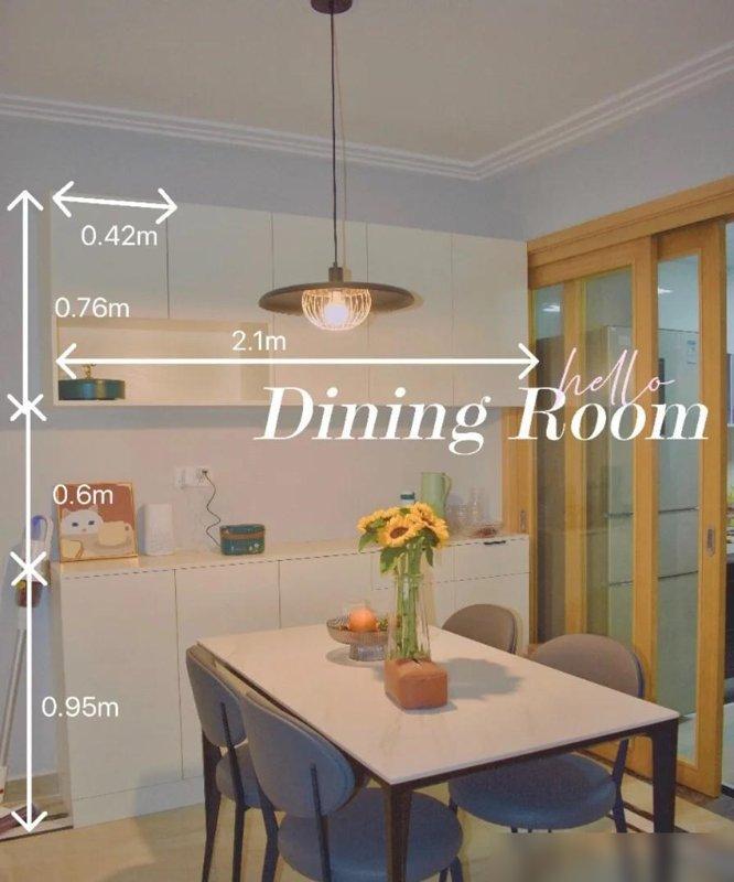 餐廳的白色巖板餐桌,不是“大到佔滿客廳”的長方形,而是剛好能坐四、五個人的大小,高腳細腿像舞者的腳踝,搬椅子時不磨地板;鍋蓋吊燈懸在頭頂,不是“滿天星”或者“極簡線條燈”,反而像一輪小月亮,燈光柔得能把菜裏的熱氣都照得溫柔——你有沒有過這種體驗?