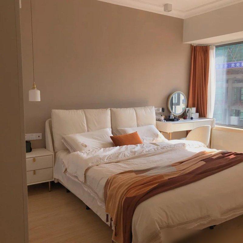 主臥的奶咖色背景牆,像衝了杯溫溫的可可,配米色牀品和橘棕蓋毯——不是“全棉四件套必須買純白色”的單調,而是“蓋上去軟、看着暖”的實在;雙開門衣櫃沒做“隱形門”,反而留着簡單的把手,打開門就能看見疊得整整齊齊的衣服,不像那些“爲了好看把衣櫃藏在牆裏”的設計,找件外套要翻遍整個房間。