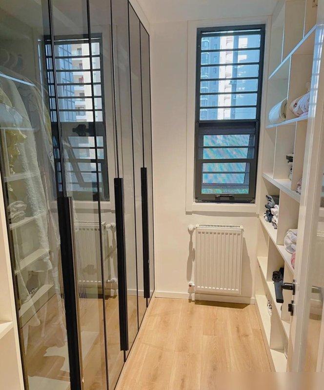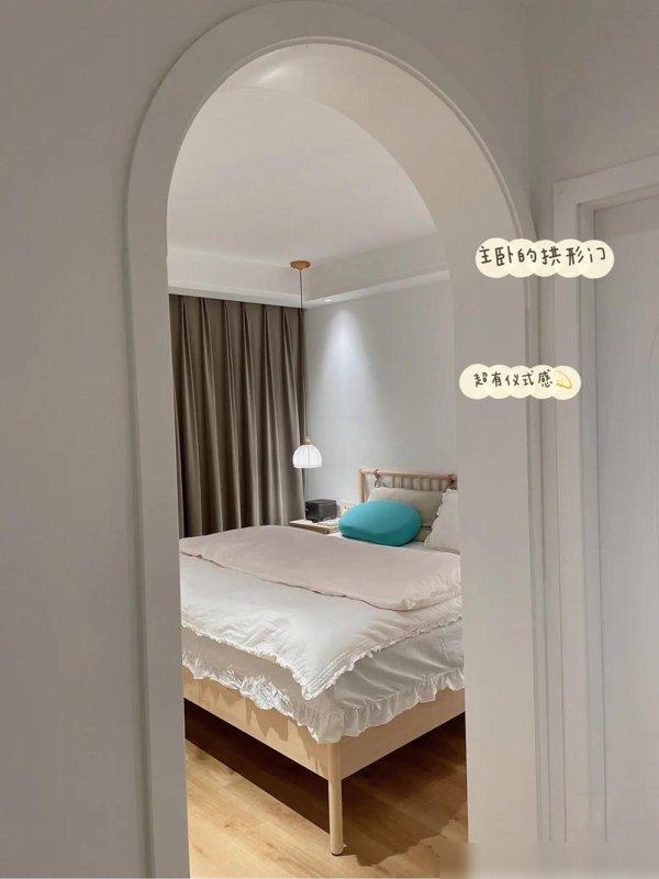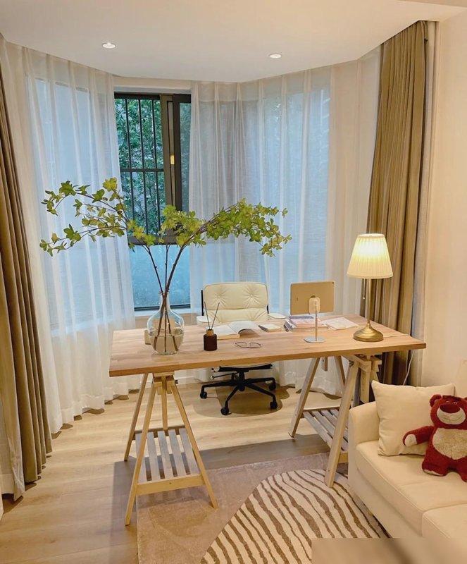 再說說“把光當家具”這件事——小房子最怕暗,可這家裏的光卻像“長了腿”:餐廳的窗戶把陽光引進來,照得原木餐桌泛着暖光;廚房的白牆反射着客廳的燈,連切菜的檯面都亮堂堂的;書房的弧形陽臺更絕,把書桌往那一支,辦公時抬頭就能看見窗外的樹,比在昏暗的房間裏盯電腦舒服太多。還有那盞餐廳的玻璃花朵吊燈,三個“小花”垂在餐桌上方,開燈時像把月光揉碎了撒在碗裏,喫個家常飯都像在約會——你說,這樣的光,是不是比裝十個筒燈還治癒?