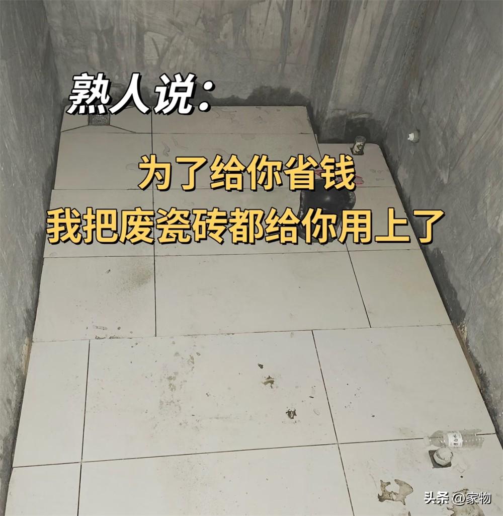 極端情況下,爲了所謂的省錢,“熟人”沒準兒會把別家的廢瓷磚給你當好磚用,反正衛生間廚房地面也用不了多少磚,運氣好,還可以勉強對縫,運氣不好,直接找個瓦工學徒給你貼個亂七八糟,你生氣也不是,不生氣也難受,真是憋屈。