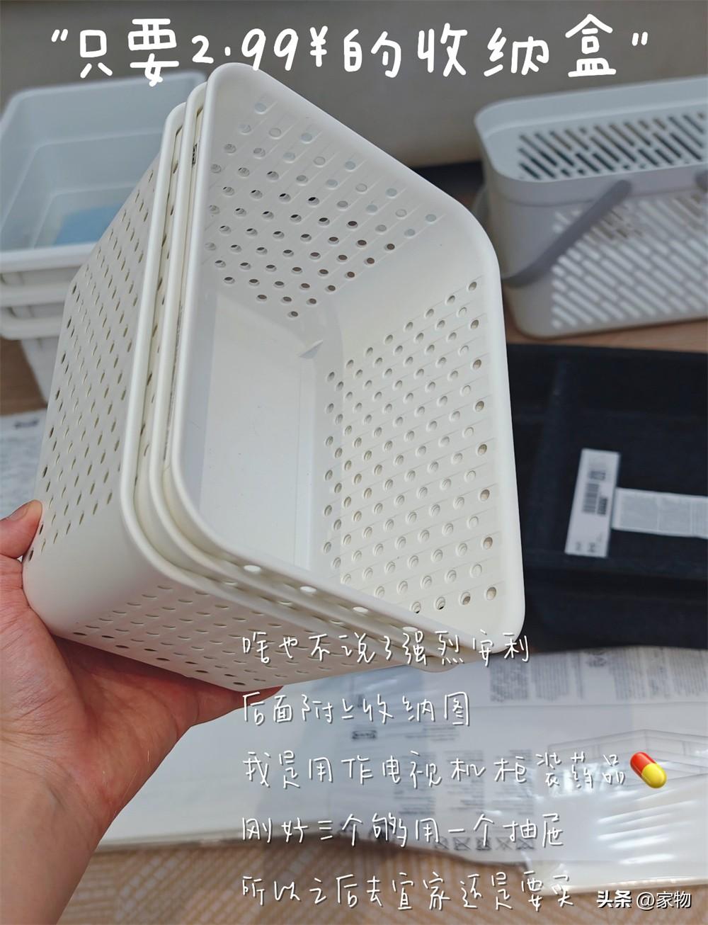還是一個特別實用的收納盒,但這個沒有蓋子,我一般是放在電視機櫃裏裝藥盒,或者是放在廚房裏當作蔥薑蒜的收納籃,當然,本身材質夠厚實,還帶透氣網眼用在衛生間當作一個淋浴洗漱用品收納盒也完全沒問題。