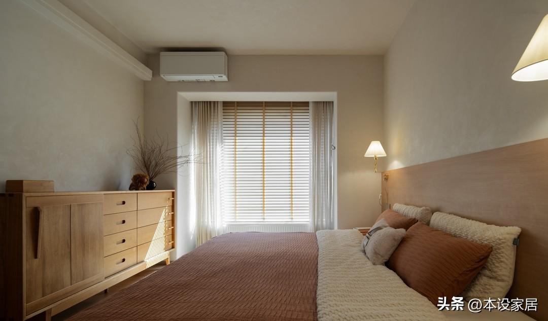 由於次臥和家政間都設置儲物櫃,只定制一組實木鬥櫃添加收納空間,在擺下一張雙人牀及牀頭櫃後,空間依然顯寬敞,留出了日後可能使用輪椅的通道。