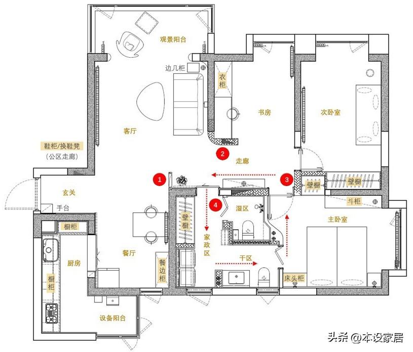 他們的房子面積94㎡,是3居室的格局,全屋基本保留原有的功能佈局,上圖中4個紅點牆體做了增減,其中最大的改造,就是將兩個衛生間打通,將家政間與衛生間統一設計,並形成洄游動線,方便日常使用。