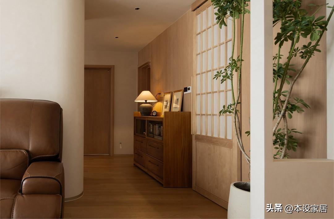走廊的位置放置一個實木儲物櫃,收納常看的書籍和常用的生活用品,拿去方便,搭配一模綠植,清新淡雅,超治癒。