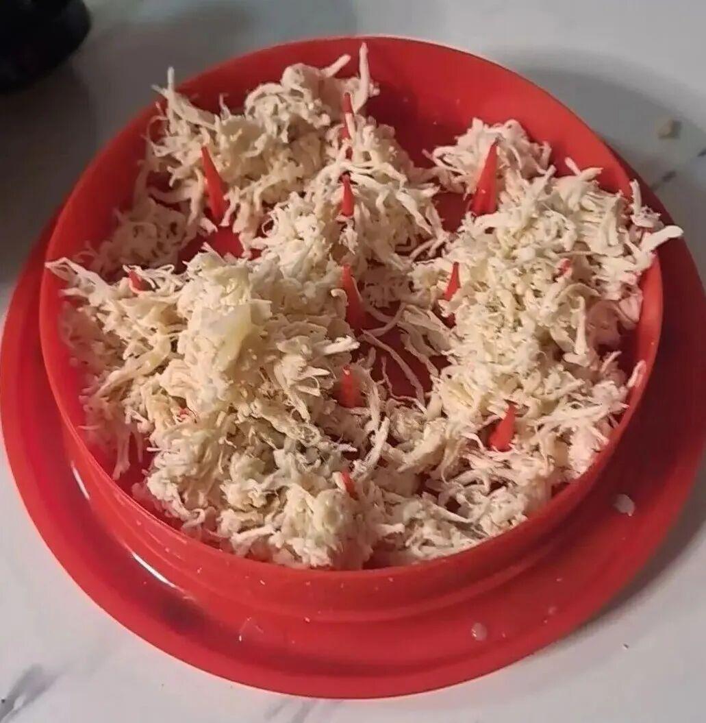 裏面是很多尖尖的齒,只需要把蓋子蓋上,握緊把手轉上幾圈,就能輕鬆撕肉。