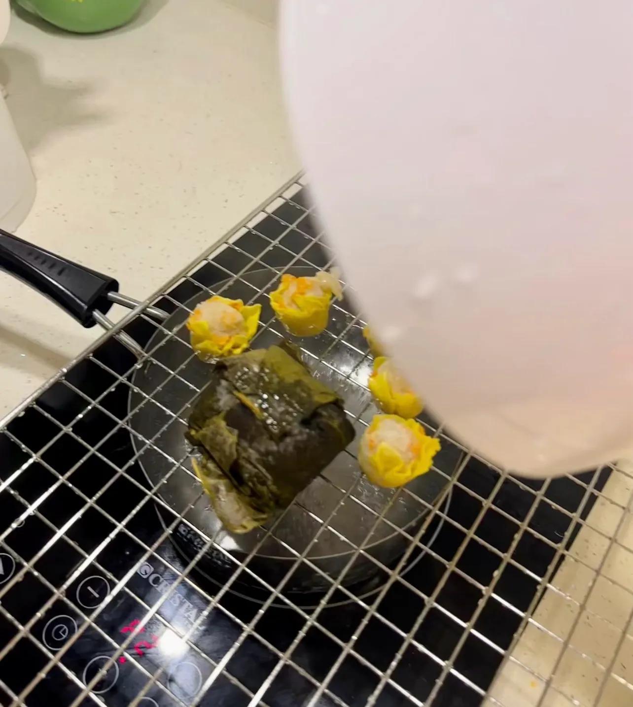 小鍋裝上水,架上烤網,鋪上蝦餃、燒麥、糯米雞……