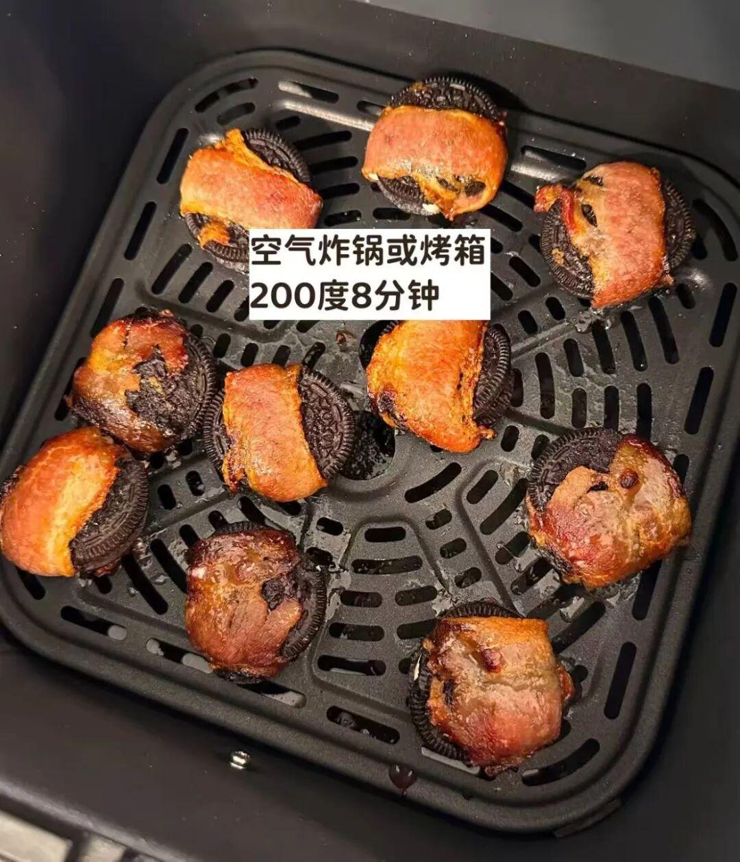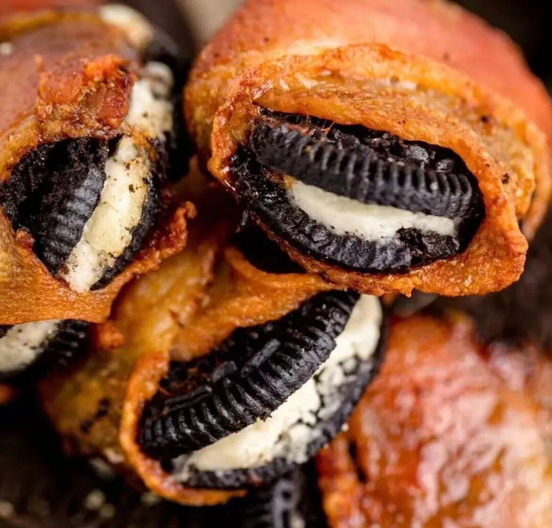 奧利奧炸過之後是融化的狀態,加上培根的鹹味,鹹甜結合,外脆裏粉,隔壁小孩看了都得饞哭。