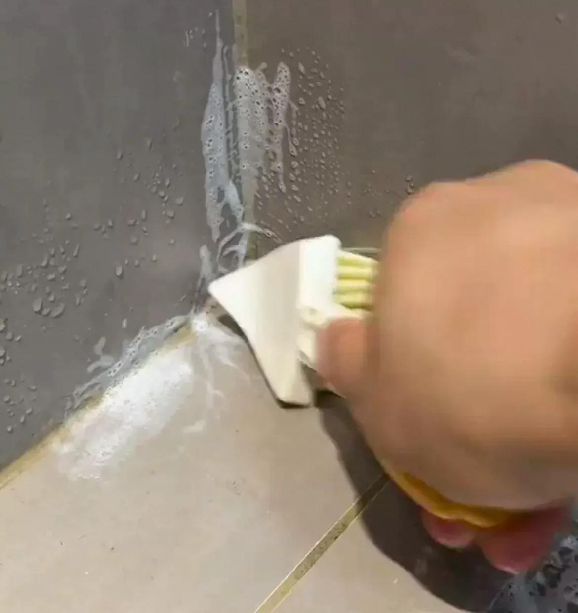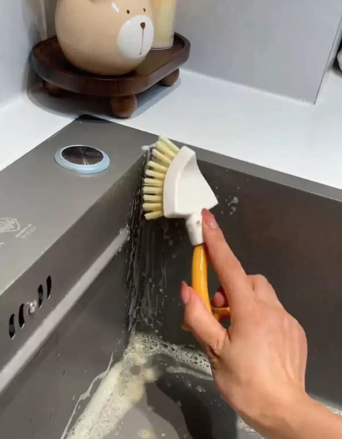 它刷頭是三角形的,邊邊又有點弧度,像水槽、牆角直角,普通刷子刷不到的、各種犄角旮旯的地方,用它的三角頭一推,都能觸及。