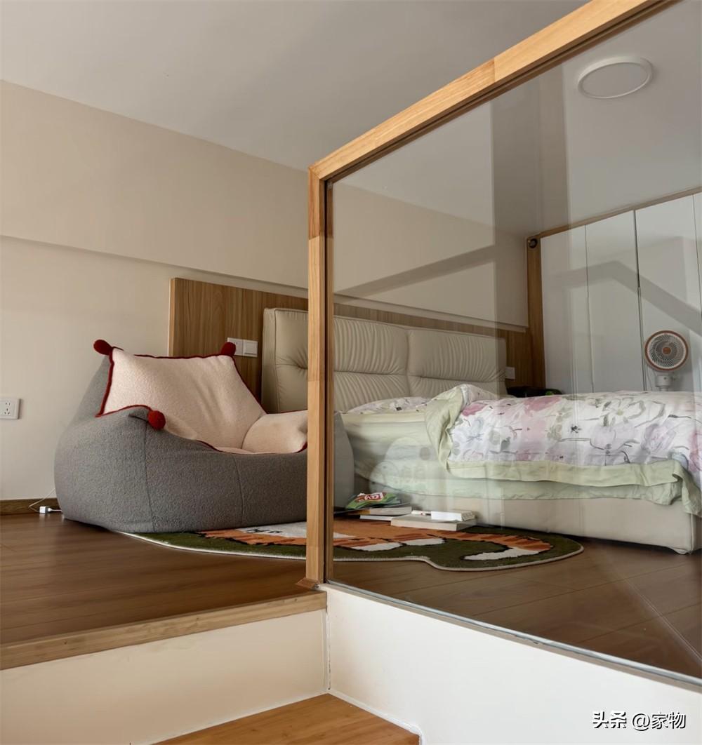 隔層上的臥室面積也不小,放下一張雙人大牀後,也有足夠的空間去做衣櫃,甚至牀頭還能放上一張懶人沙發。