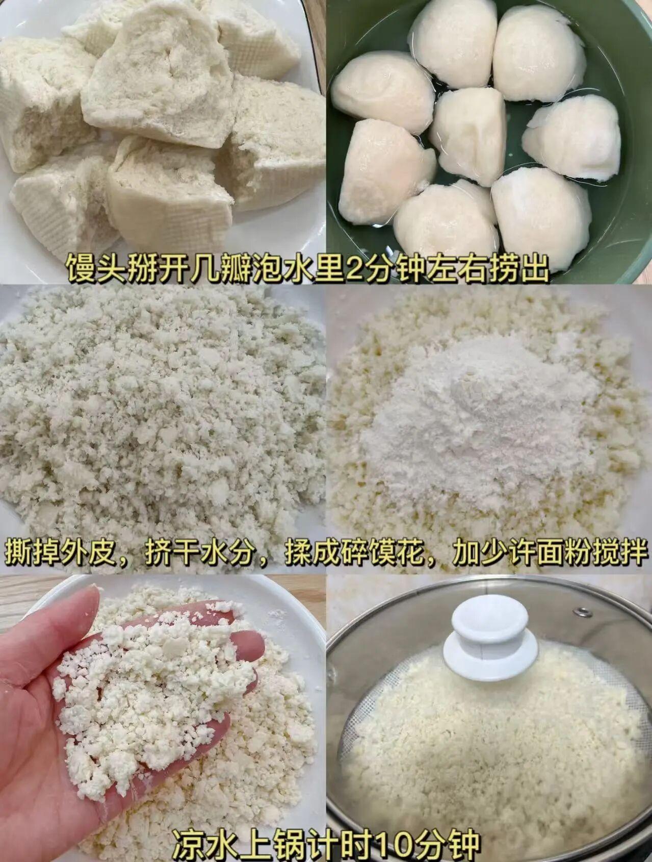 這個“搗鼓”方法的核心在於“搓”和“蒸”,將剩饅頭先耐心地搓成細碎的饅頭屑,再上鍋蒸。