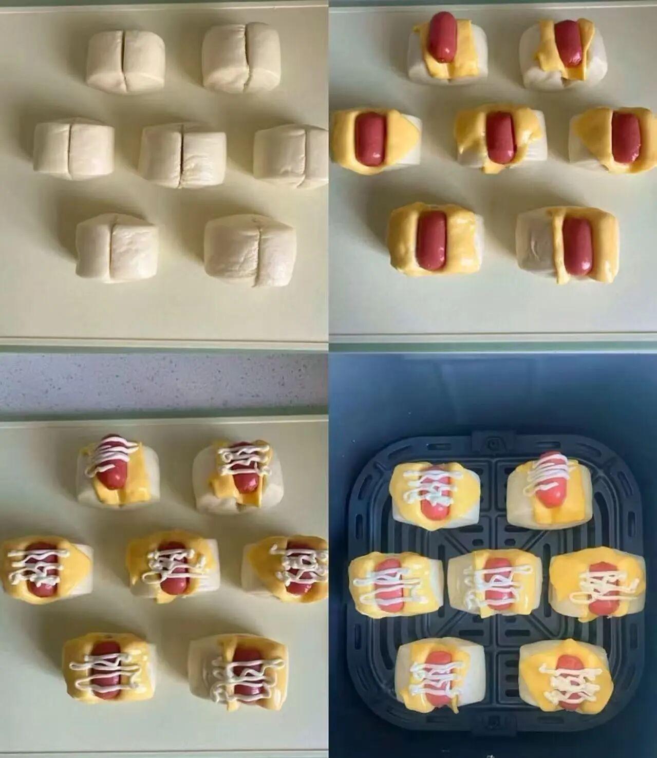 饅頭切開塞進一個小香腸,上刷一層薄薄的食用油,撒上一點點鹽和椒鹽或者放上一片芝士,喜歡還可以來點奶酪或者芝麻。