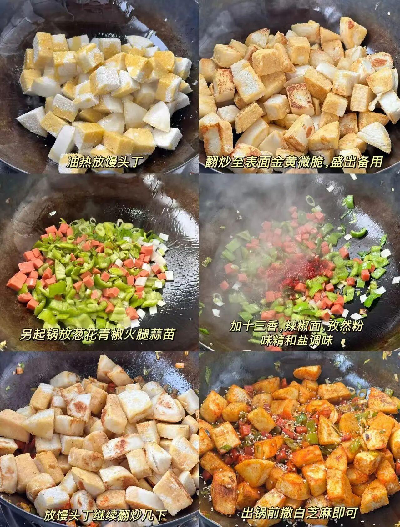 最後倒入炒好的黃金饅頭丁,快速翻炒,調入鹽和胡椒粉即可出鍋。