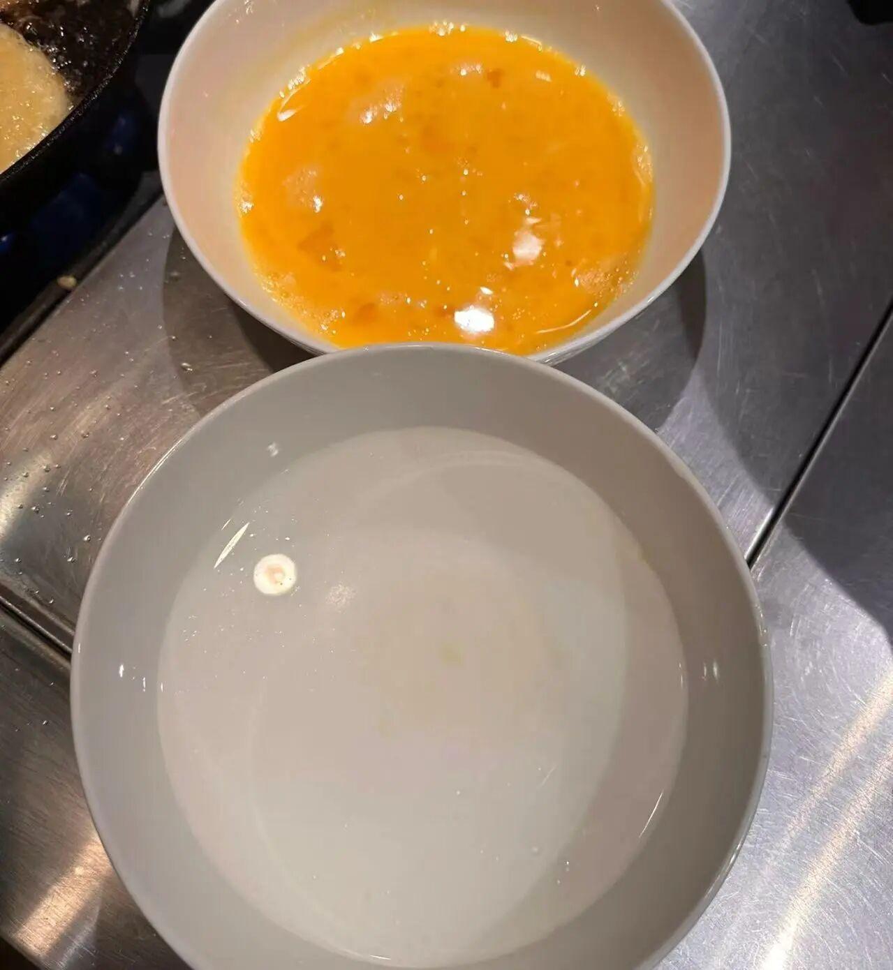 接着把饅頭塊倒進去,用勺子輕輕翻拌,讓每一塊饅頭都均勻地裹上這層“黃金外衣”。