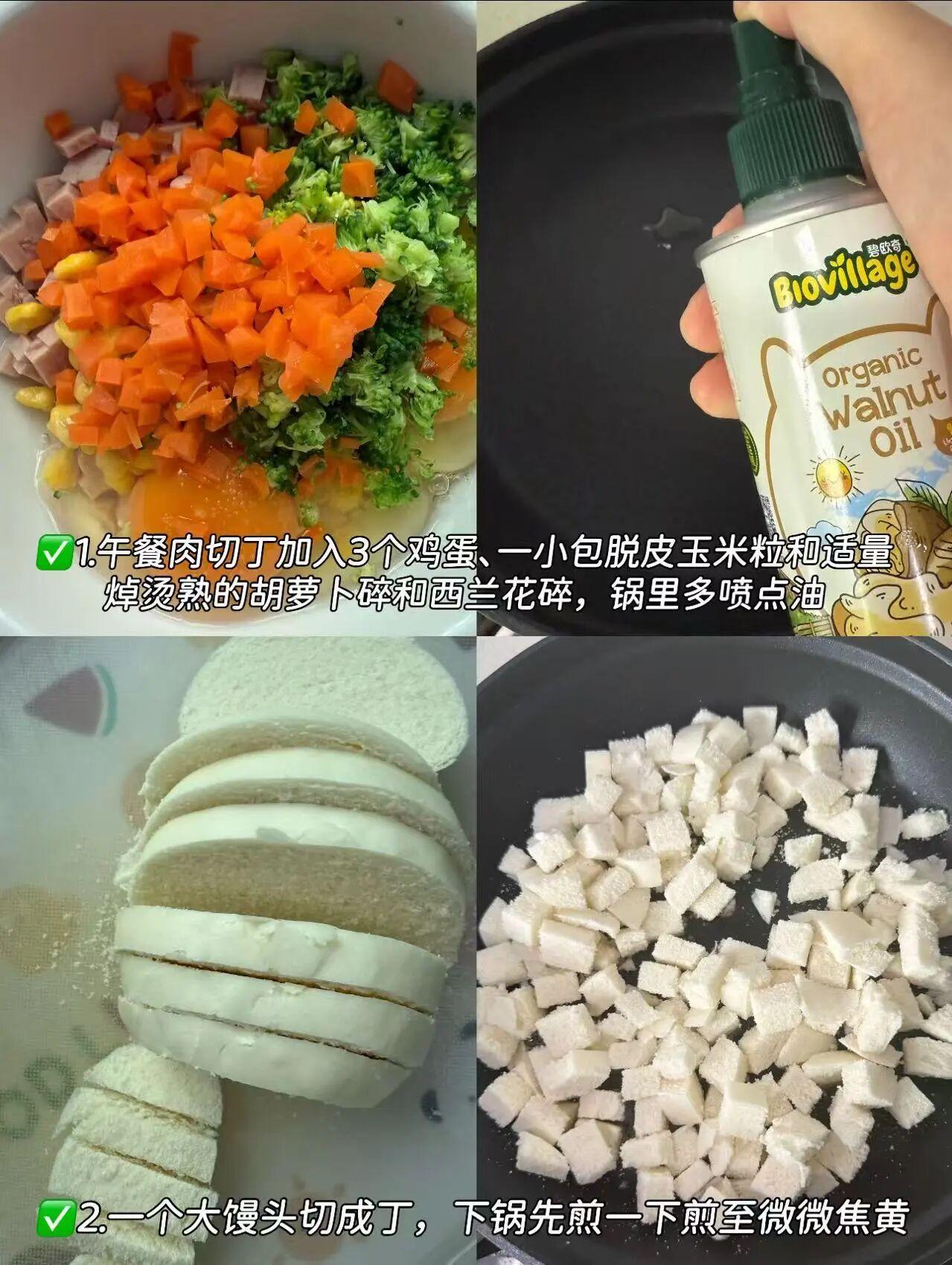 準備一些愛喫的蔬菜,比如午餐肉、胡蘿蔔、玉米粒,都焯水後切成非常碎的小丁,加入雞蛋。