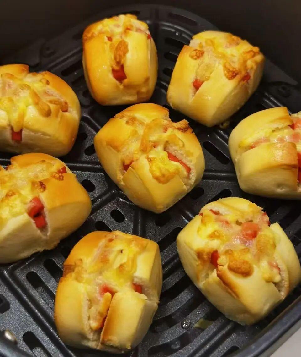 空氣炸鍋180度20分鐘就得到了一個焦香酥脆、餡料熱乎乎軟嫩的“漢堡”,一口咬下去,超滿足!
