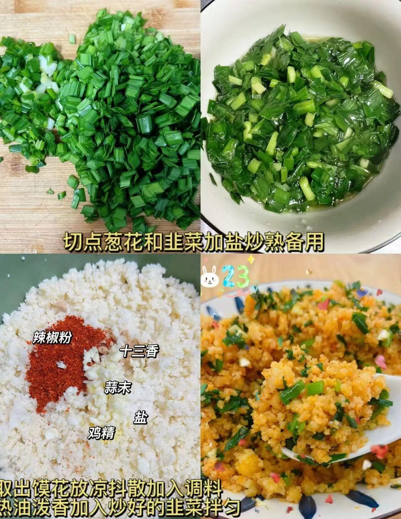 然後,切點蔥花、韭菜炒熟,然後調料混搭如上圖,熱油激香後,與饅頭屑混合在一起。