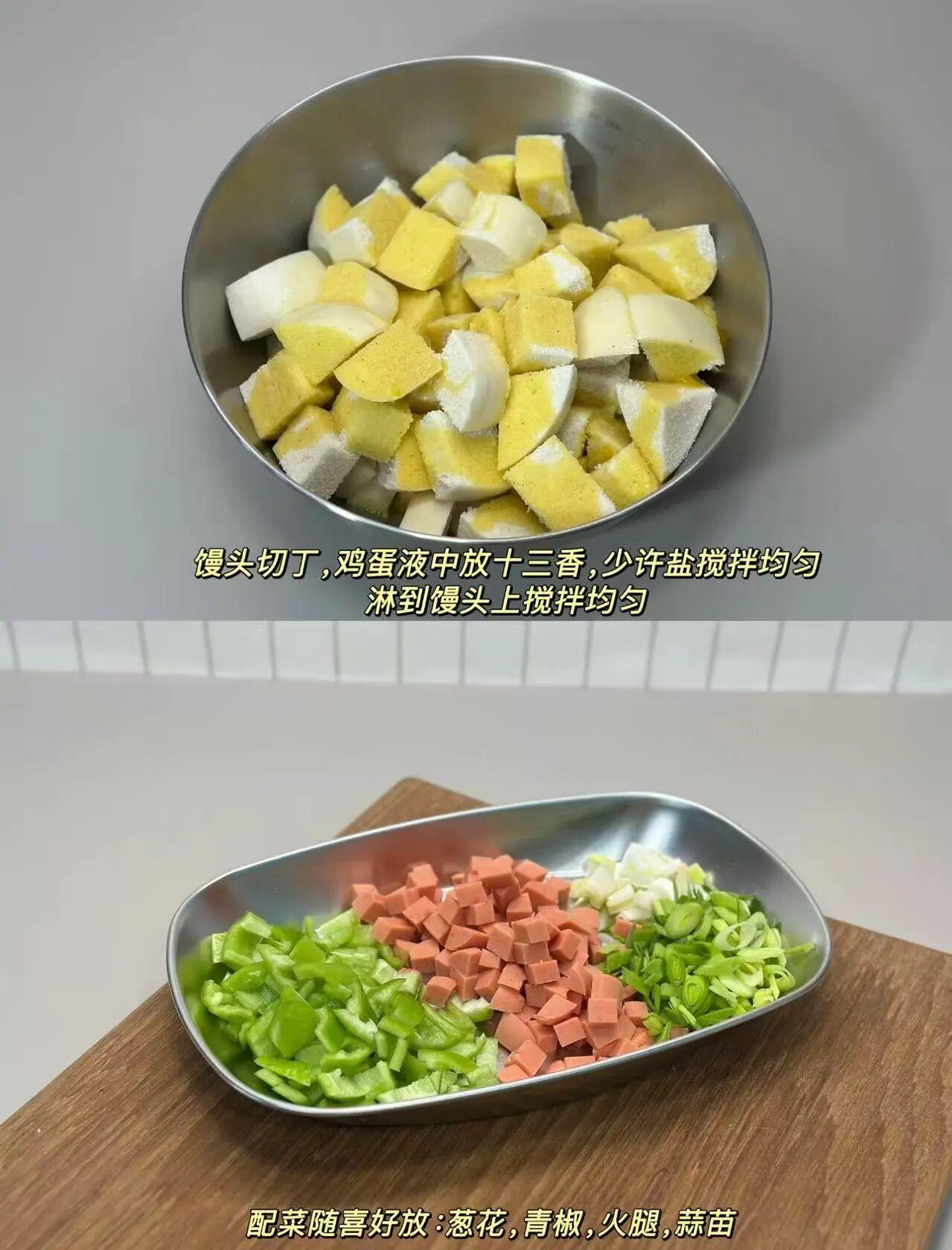 油熱倒入裹好蛋液的饅頭丁,用中火不停翻炒,直到饅頭丁變得粒粒金黃、外皮焦香後盛出備用。