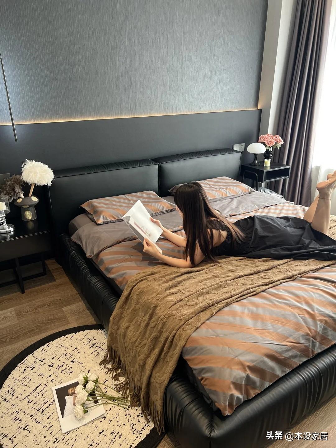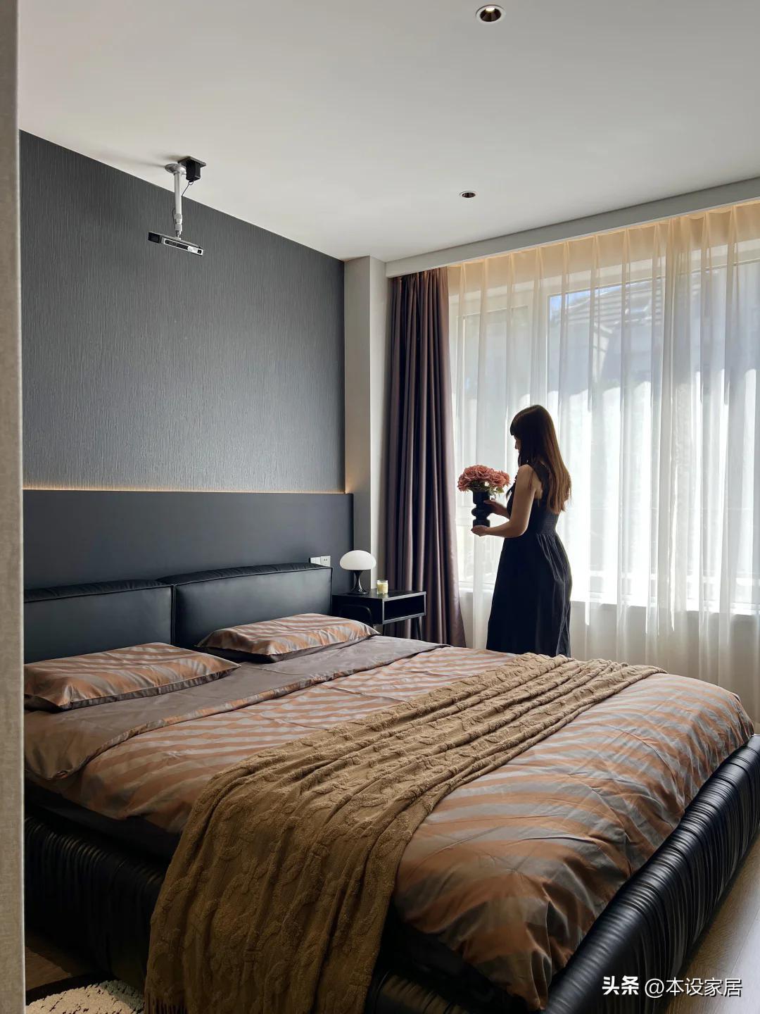 牀頭背景牆貼灰色牆紙,配深色皮質傢俱和淺咖色的牀品,溫潤又有層次,雖然沒有繁雜裝飾和造型,卻透着一股靜謐治癒的鬆弛感。