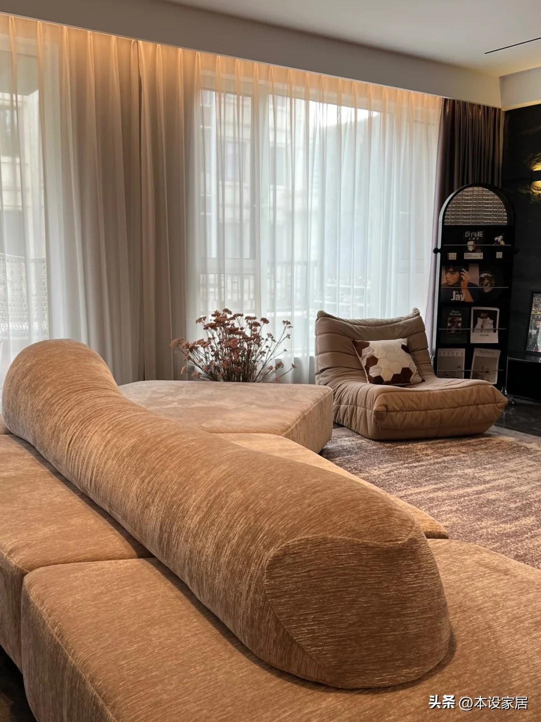 地面滿鋪咖色大理石肌理瓷磚,搭配同色系的布藝沙發和與毛毛蟲單椅,顯得沉穩內斂又不失新意, 而且這些傢俱都保持在較低的水平面,或坐或臥或躺,都讓生活的狀態更舒適和休閒。