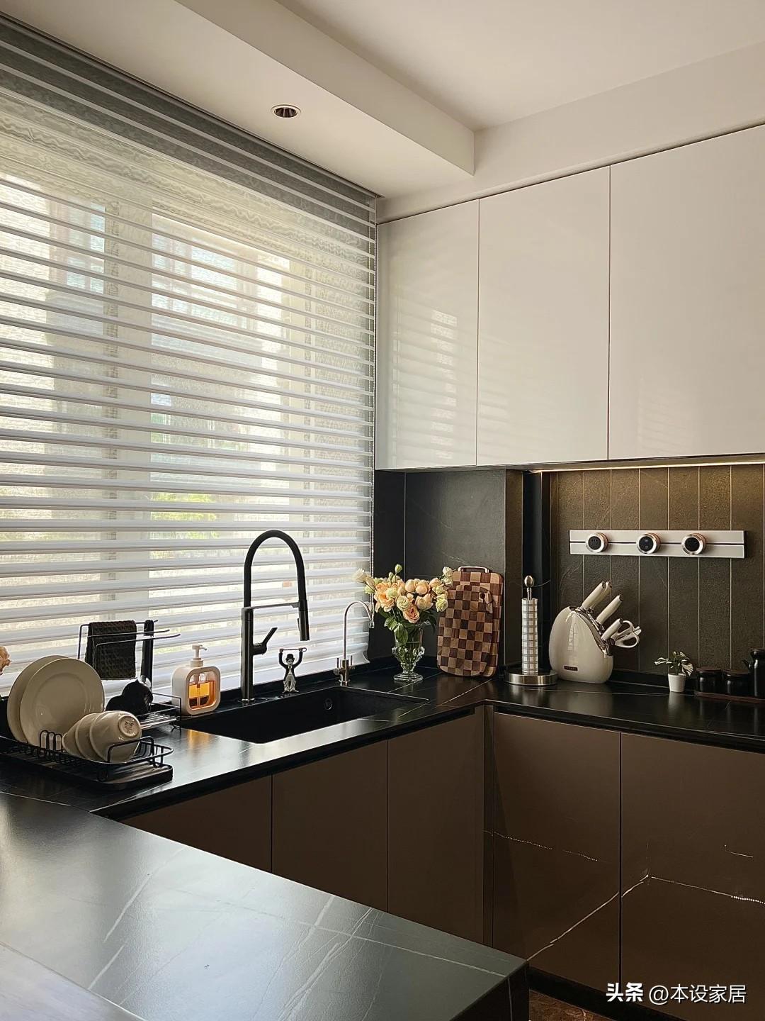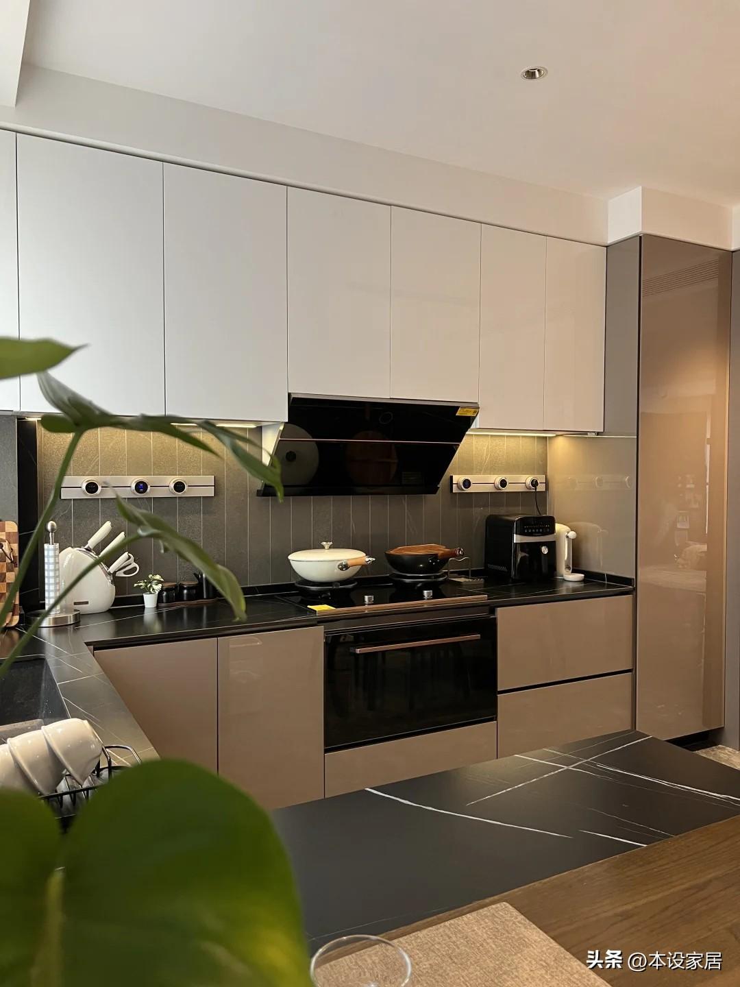 U型的廚房提供了更多的操作檯面和儲物空間,香檳色和乳白色的櫥櫃, 與黑色巖板檯面的搭配, 在視覺上增加空間高級感,也平衡了煙火氣息空間的“油膩感”。