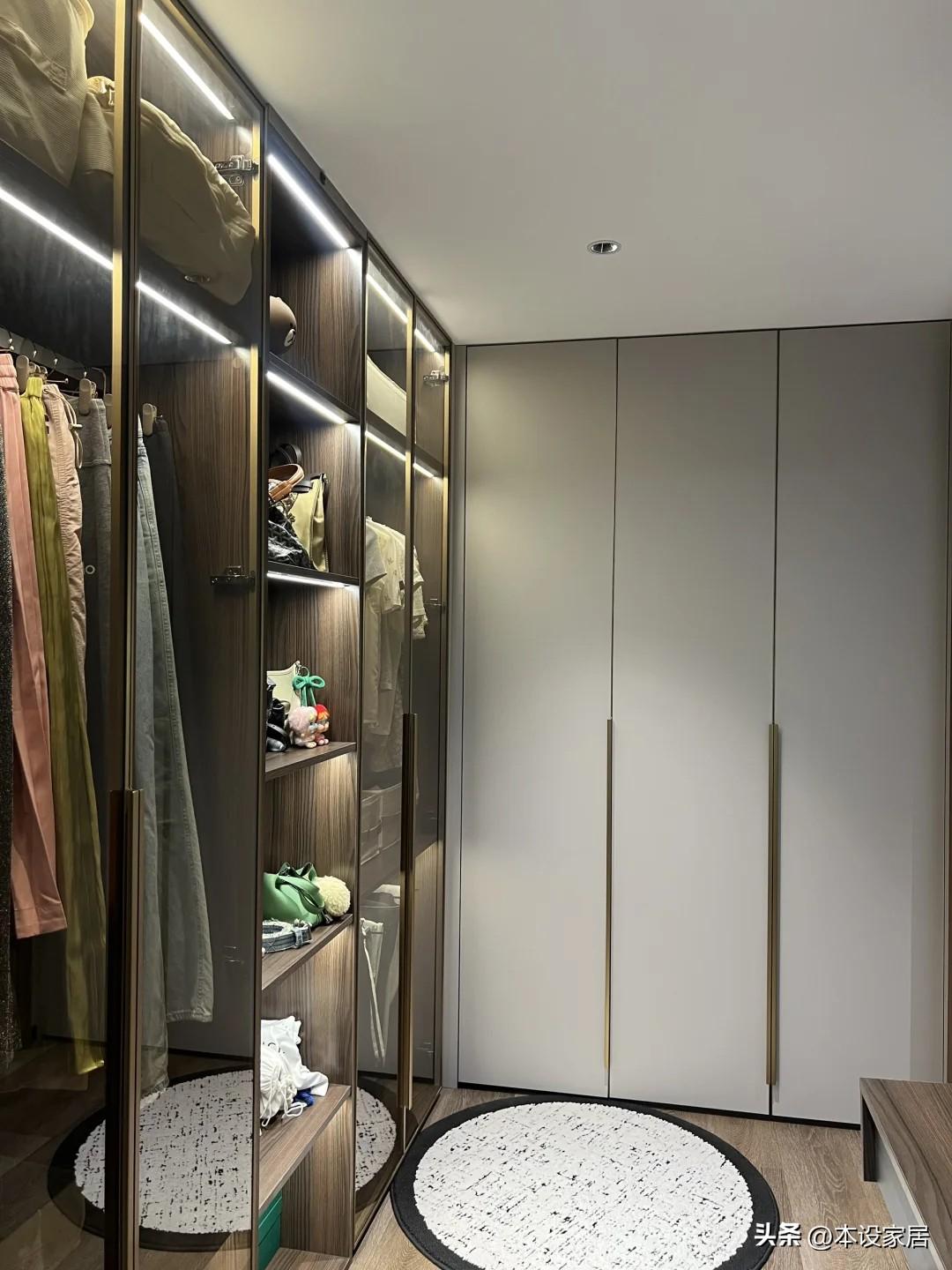 衣帽間與臥室一牆之隔,L型的儲物櫃設計,帶玻璃的儲物櫃可以收納當季衣物和包包,而白色櫃門內,則可以放置換季的衣物和被褥,關上櫃門,目之所及,乾淨整潔,空間感也明顯提升。