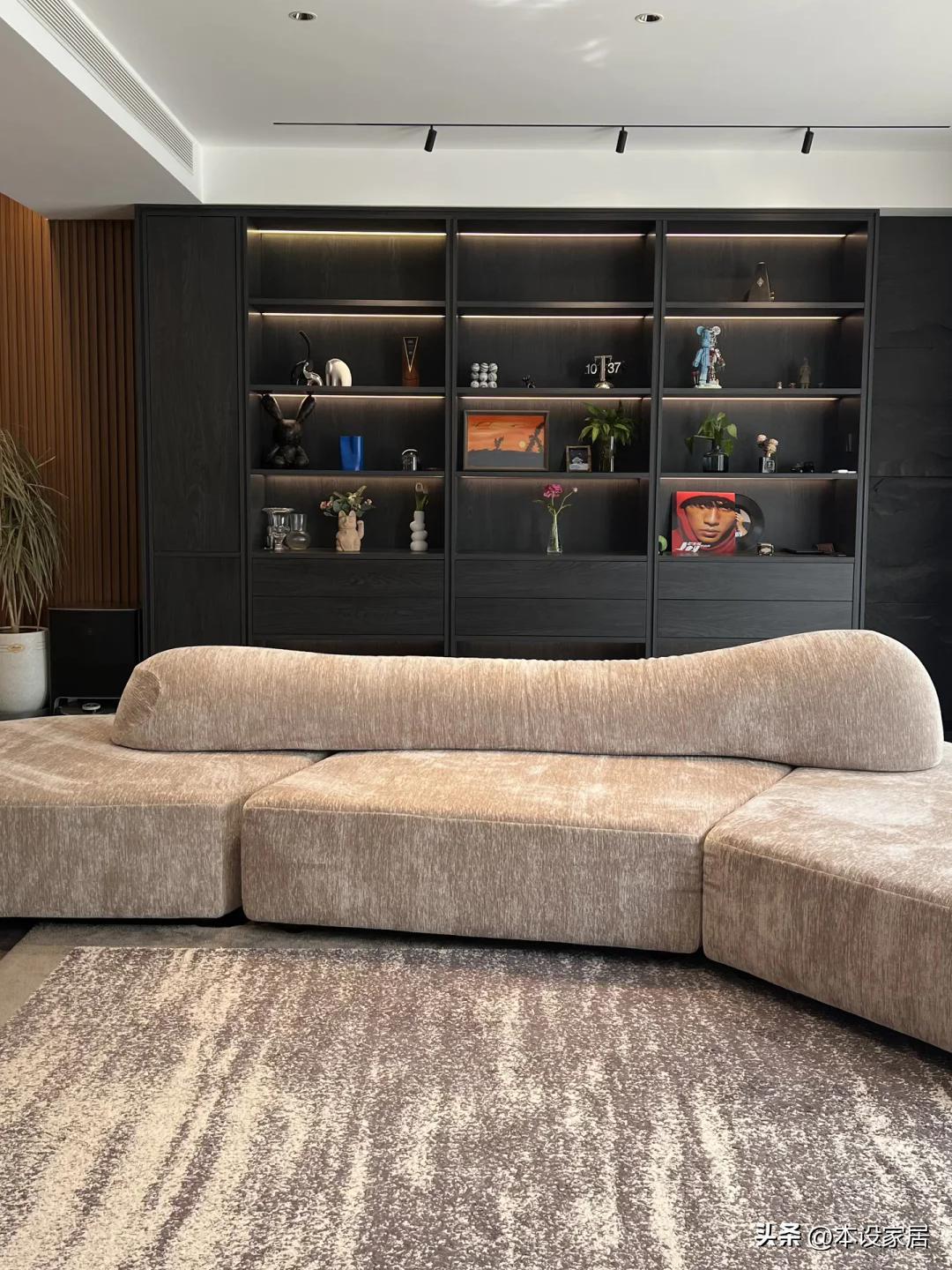 沙發背面靠牆,定製一組深色的木製儲物櫃,擺上書籍和展示品,高級又不失格調。