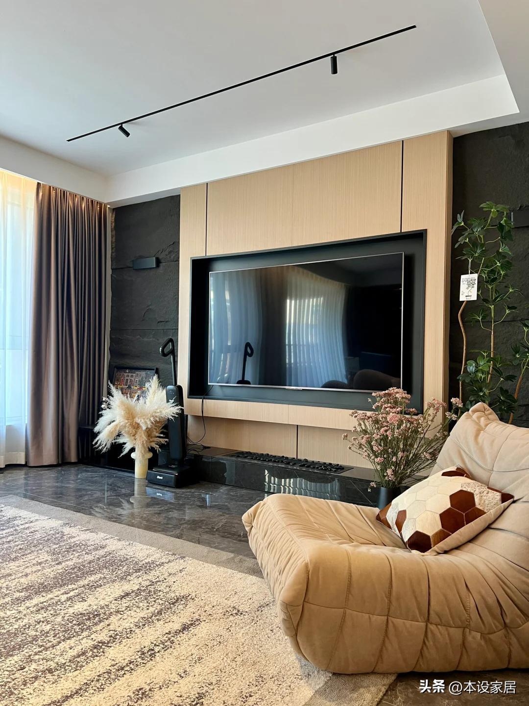 電視背景牆造型簡約,以深色爲基地,將電視機巧妙地嵌入式安裝到“凹”造型中,看起來整潔,再搭配綠植和鮮花,帶來一絲自然的呼吸。