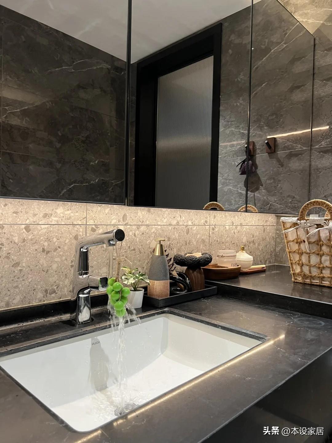 主衛與次衛基本保持一致,只是洗漱臺融入原木色,與深灰石材營造出一份沉穩感,而充裕的空間置入浴缸,豪華感盡顯。