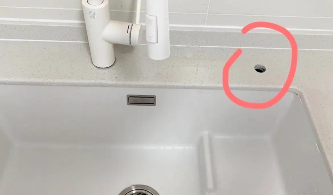 當時裝修時,除了水龍頭外,我只讓師傅開了一個洞,心想着反正是順手的事,日後隱藏個洗潔精瓶子也行,省的檯面周圍亂七八糟。