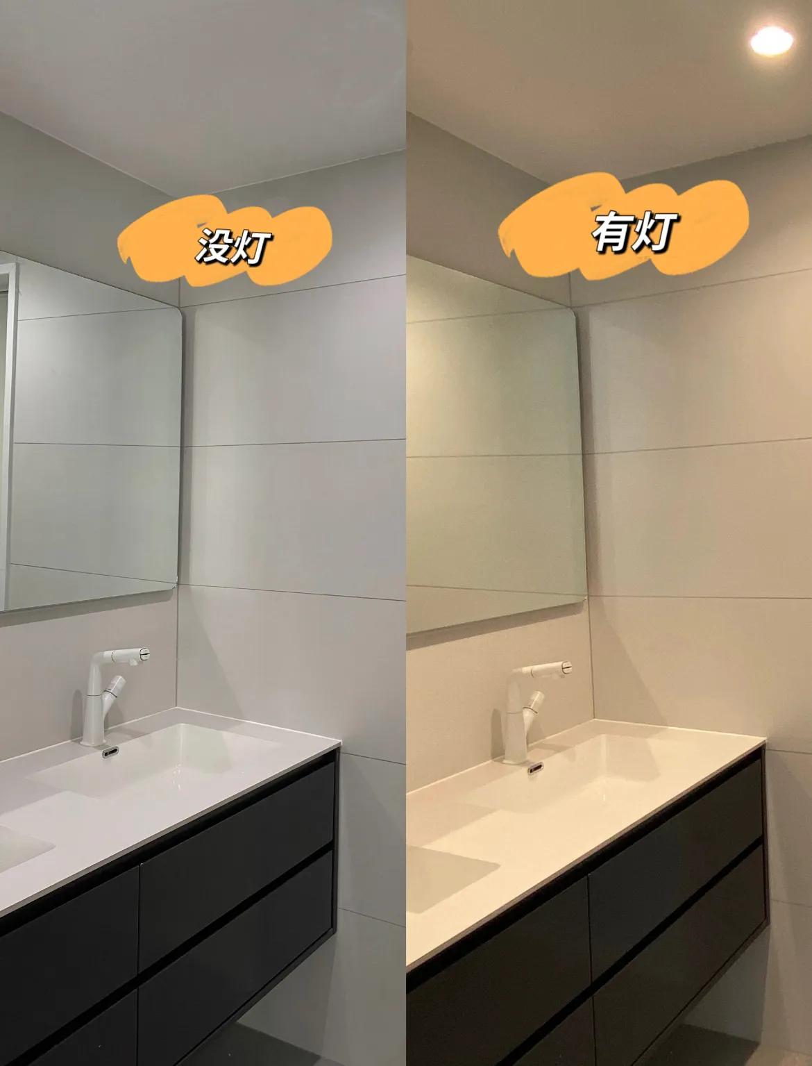 所以我一個後悔沒留的洞就是衛生間頂上,如果當初能在臺面頂部安裝一個射燈,那麼照亮檯面的同時,還能給人臉前面增加一道照下來的光,讓鏡子前的人更加清晰好看。