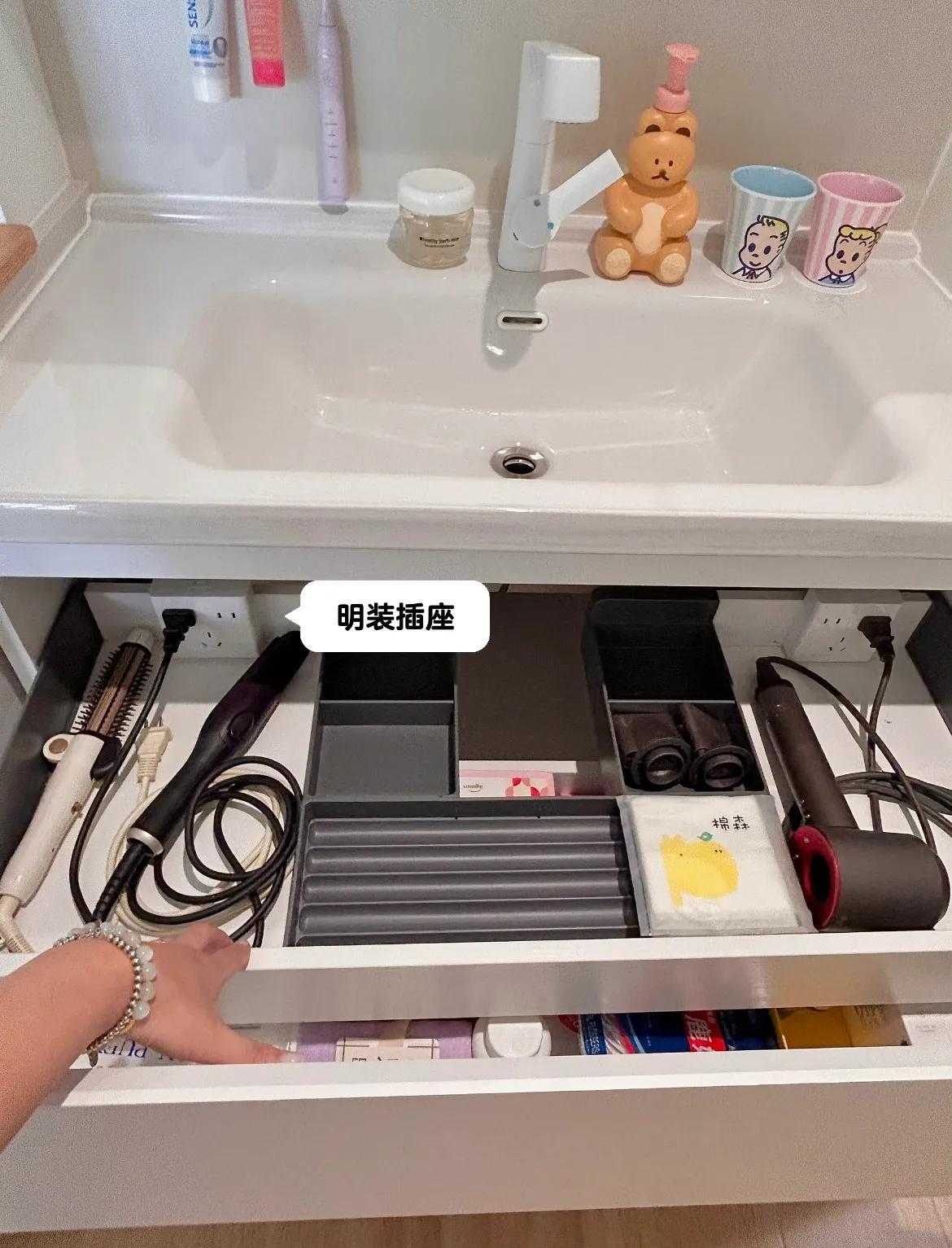 入住前,我覺得浴室櫃就是放洗漱用品的,結果入住後才發現,最大的痛點是吹風機、捲髮棒、電動牙刷,充電都要往出浪。