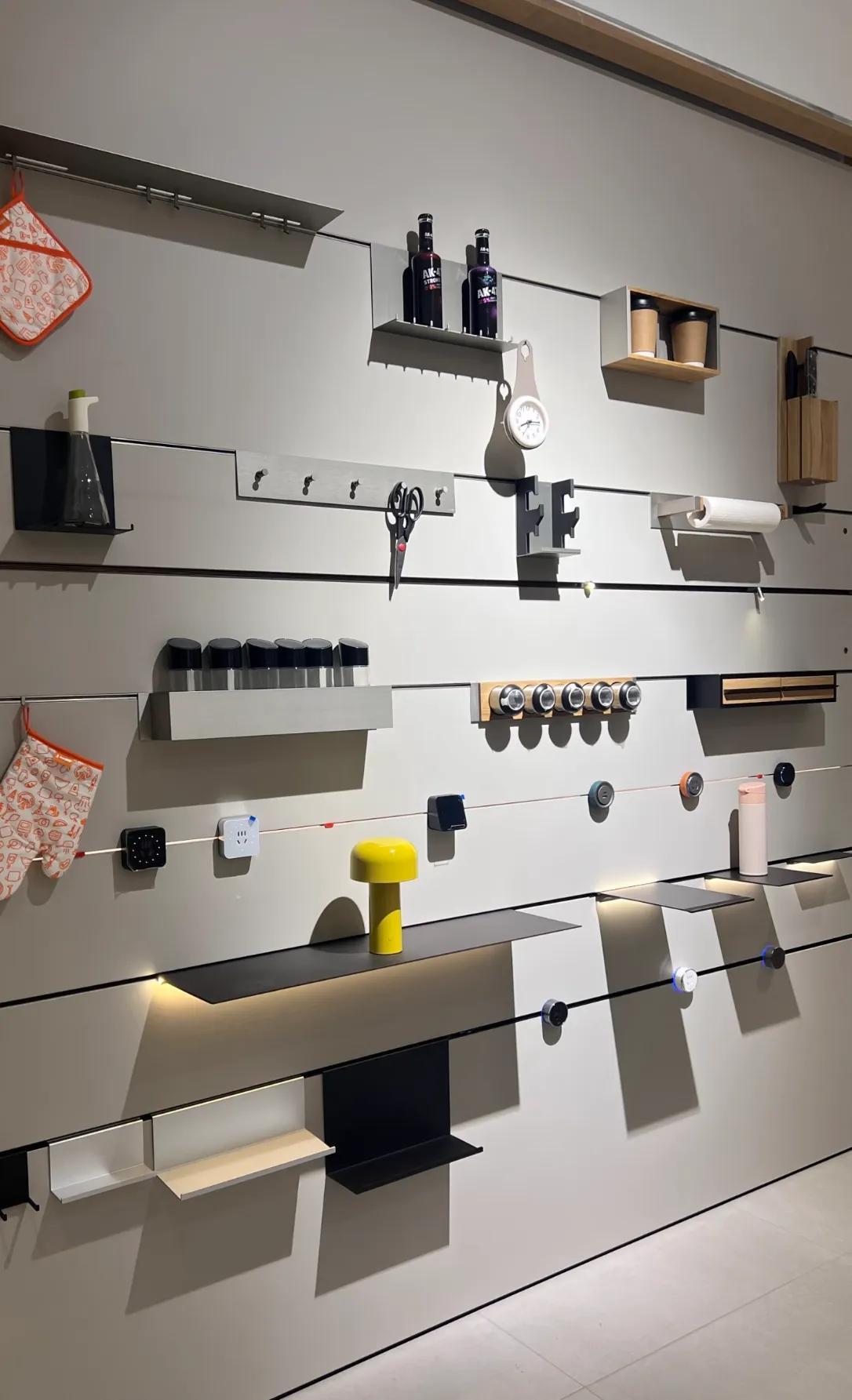 做法很簡單,暗裝滑軌預埋入牆,然後照正常順序鋪護牆板或瓷磚即可,後面廚房的小工具、瓶瓶罐罐就能實現上牆收納,解放廚房檯面。