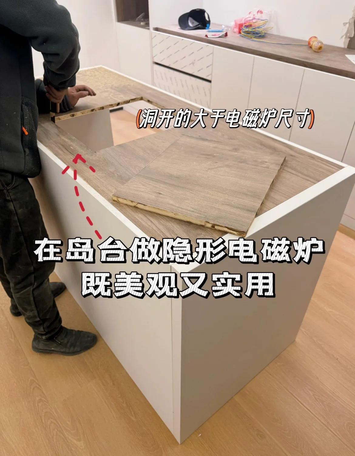 後來才明白,其實家裏用電磁爐的,只要在島臺打底櫃上開個電磁爐大小的孔,注意線槽也一併開好,最後在島檯面上定好開關的位置,就能get一個隱藏式電磁爐。