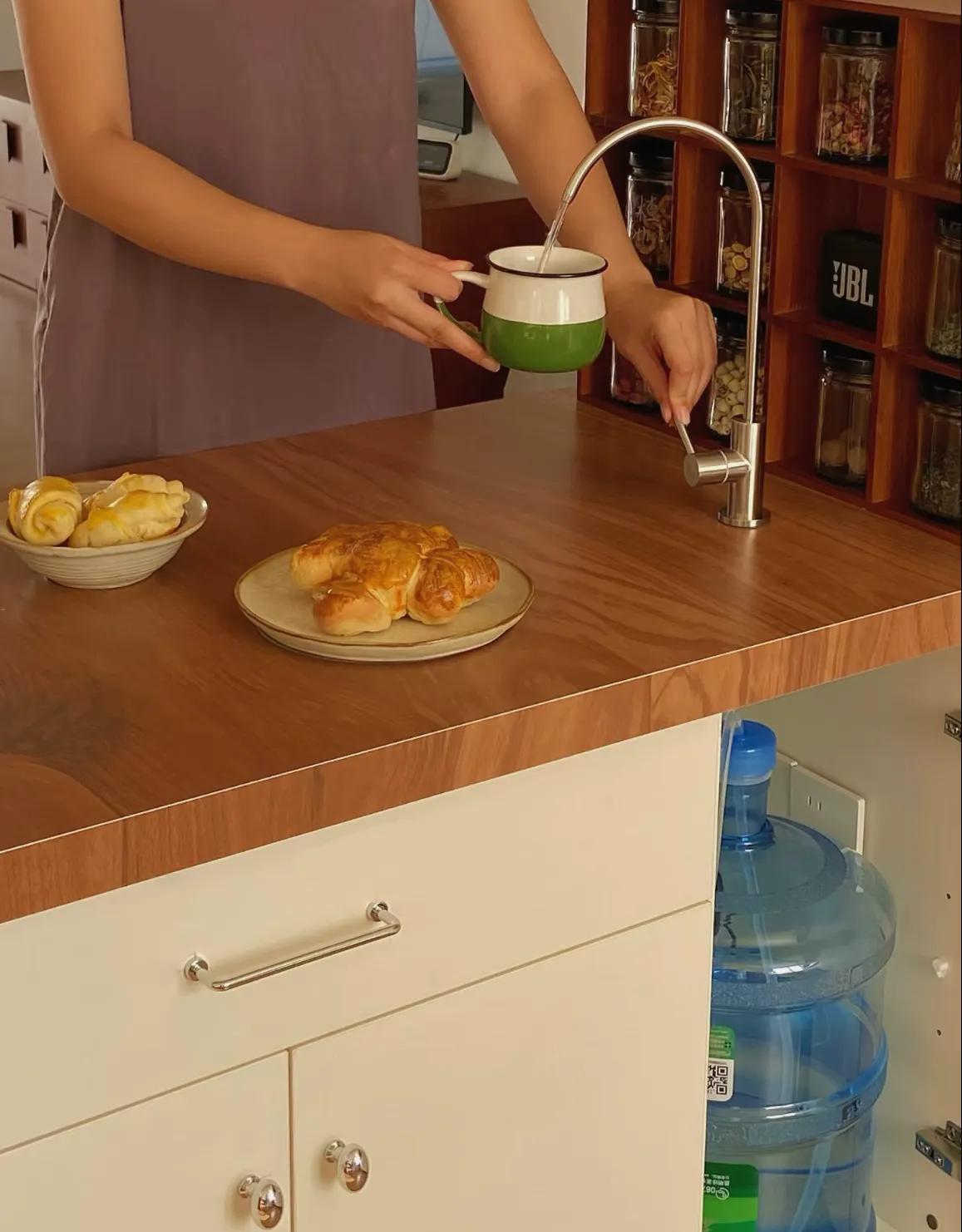 當初想裝管線機,結果一聽報價,主機上千,還要改水電,果斷放棄,因爲只要在水吧檯櫃子上開個小孔,就能實現“隱藏式桶裝水”。