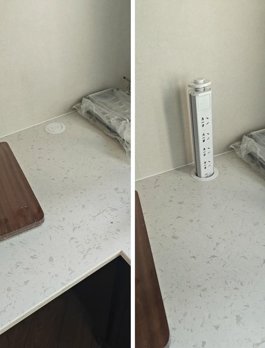 後來發現,只要在臺面上開個孔,裝個升降插座,問題全解決。