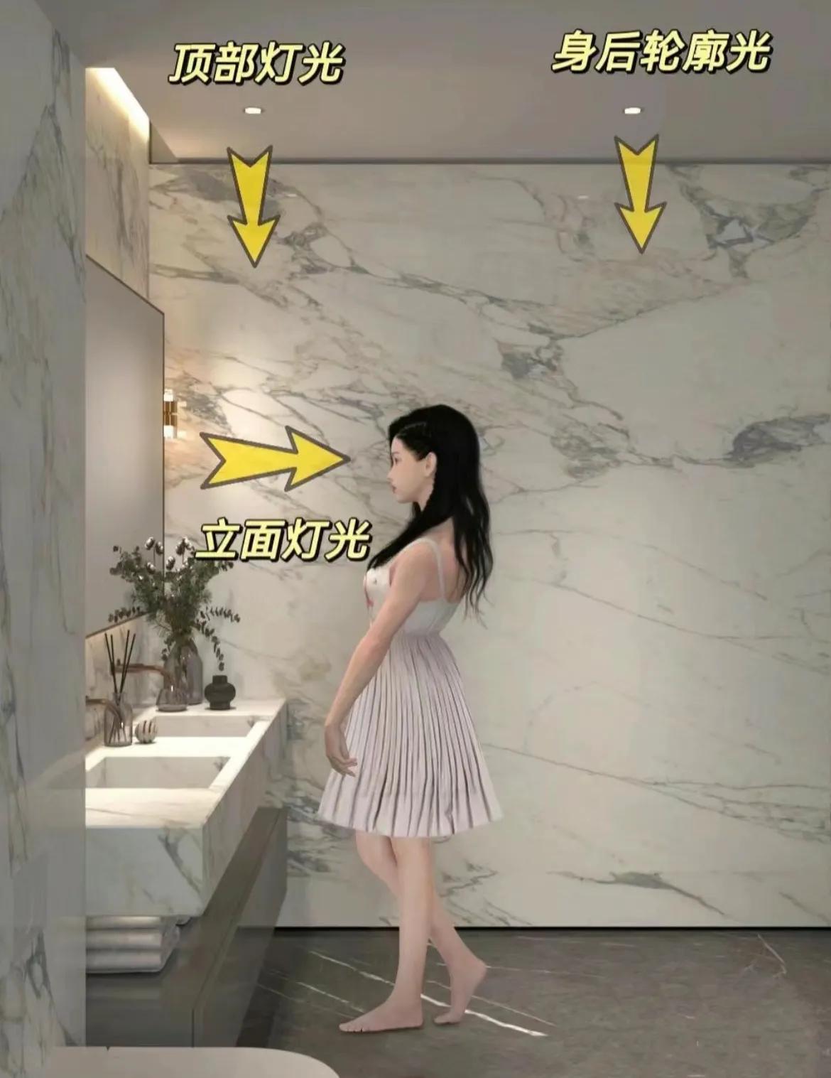 但真正入住後你會發現,一箇中心點的照明,難免會遇到陰影、暗區的問題,尤其是人在鏡子前照鏡子,燈光從側後方來,那臉部就會形成暗區,普通人看着臉色皴黑,化妝的人更苦,辛苦畫完卻容易假面,很不友好。