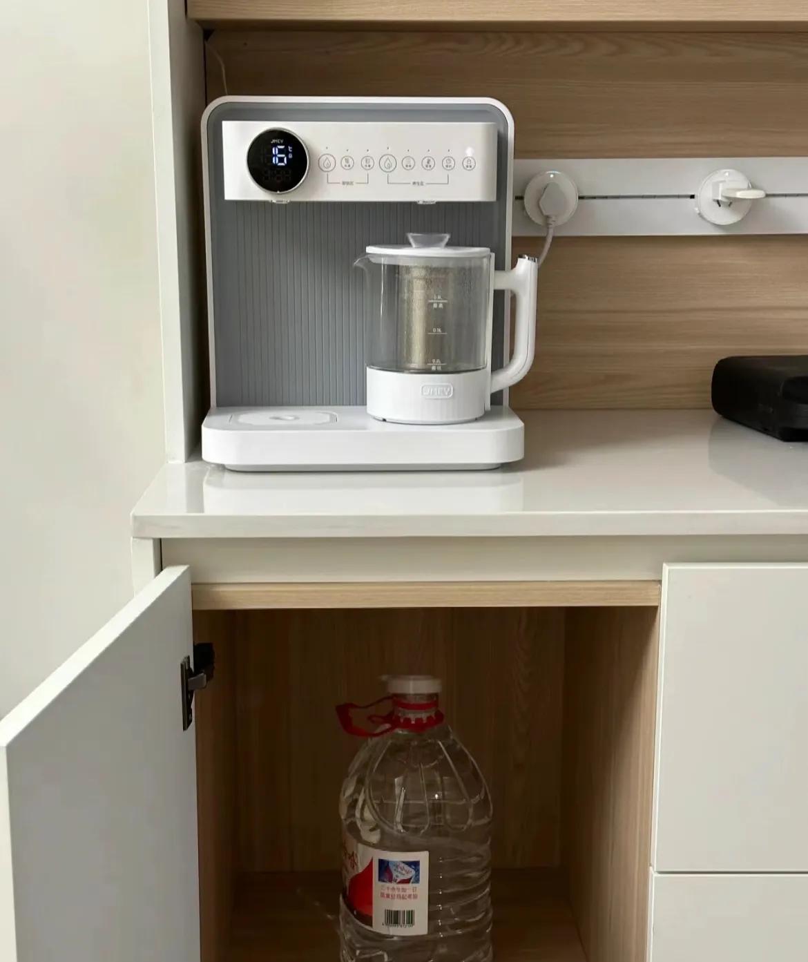 桶裝水直接推進櫃子,水管穿過小孔,外面只露出一個電動抽水器,看起來簡潔大方。