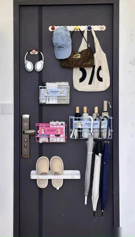 最上面掛第二天要穿的外套,不用早上翻衣櫃翻得手忙腳亂;中間層塞着充電寶、鑰匙這類小雜物,拿的時候一摸就着;最下面的掛鉤專門掛鞋子,連鞋櫃都省了——這哪是玄關啊,明明是把“出門要帶的東西”全“貼”在了門上,垂直空間用到了極致。