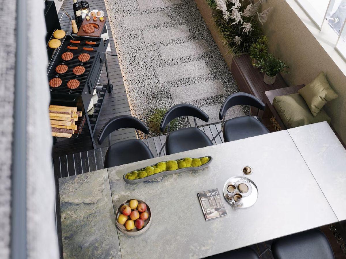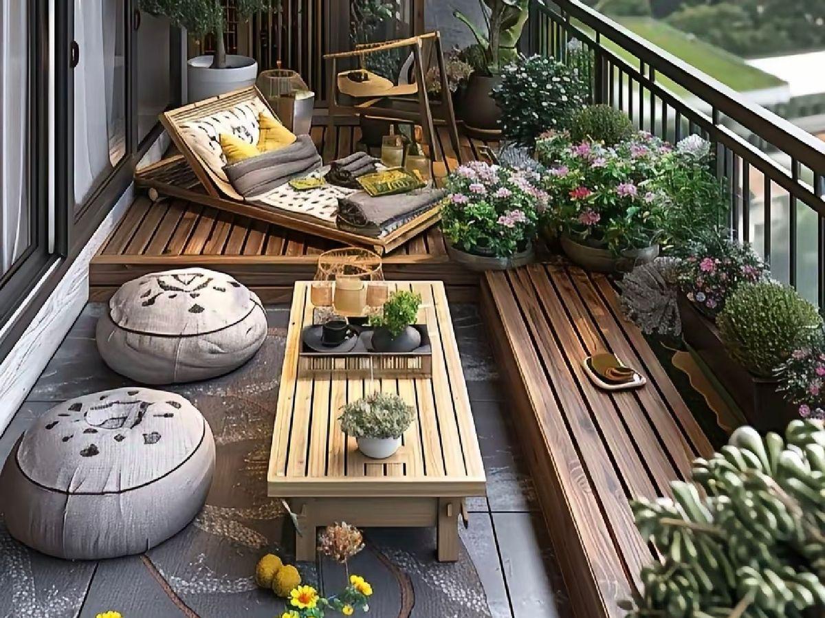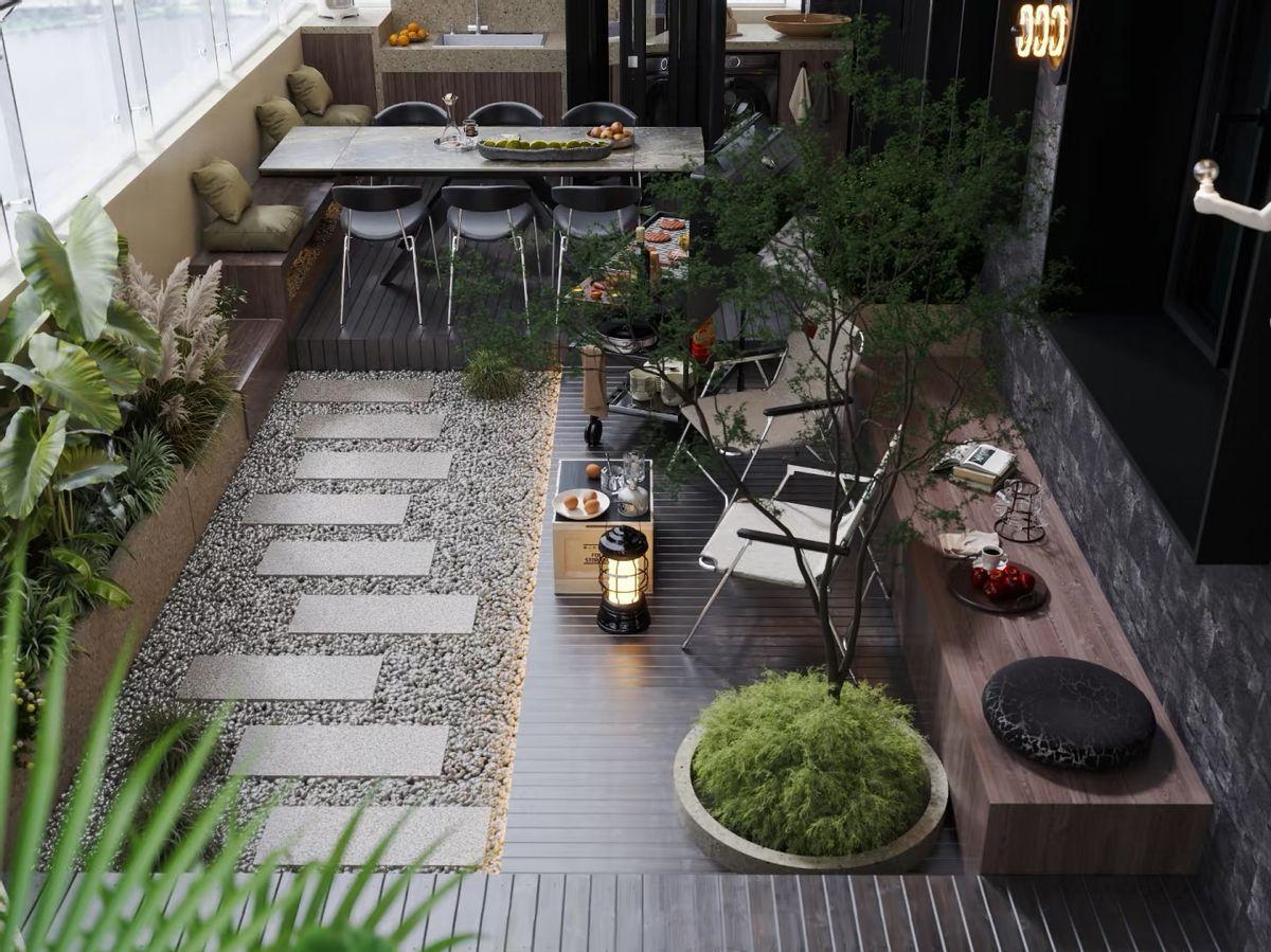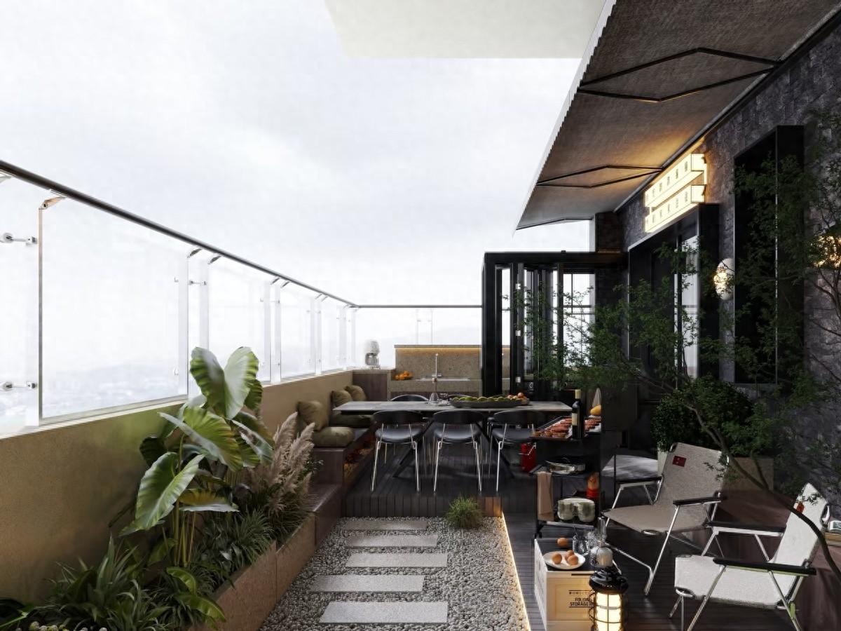 做法就是將陽臺區域降低15~20公分。當然了,要做好防水和排水系統,確保坡度利於排水。在周邊可以設置座椅,中間區域可以做休閒區或綠化區。