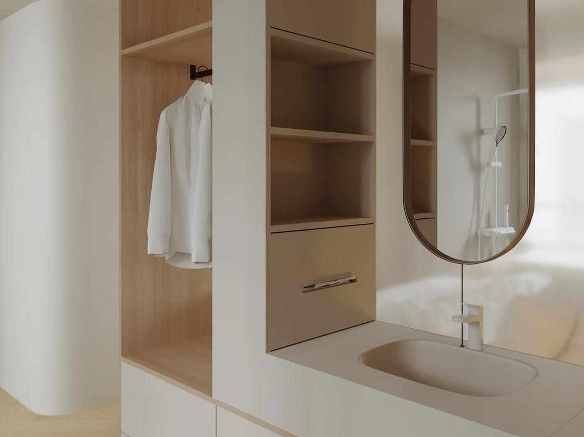 衛生間內的迷你衣帽間,要確保通風良好。可選擇安裝換氣量大的排氣扇。避免將衣櫃設置在淋浴區附近,還要定期檢查櫃子內的溼度。