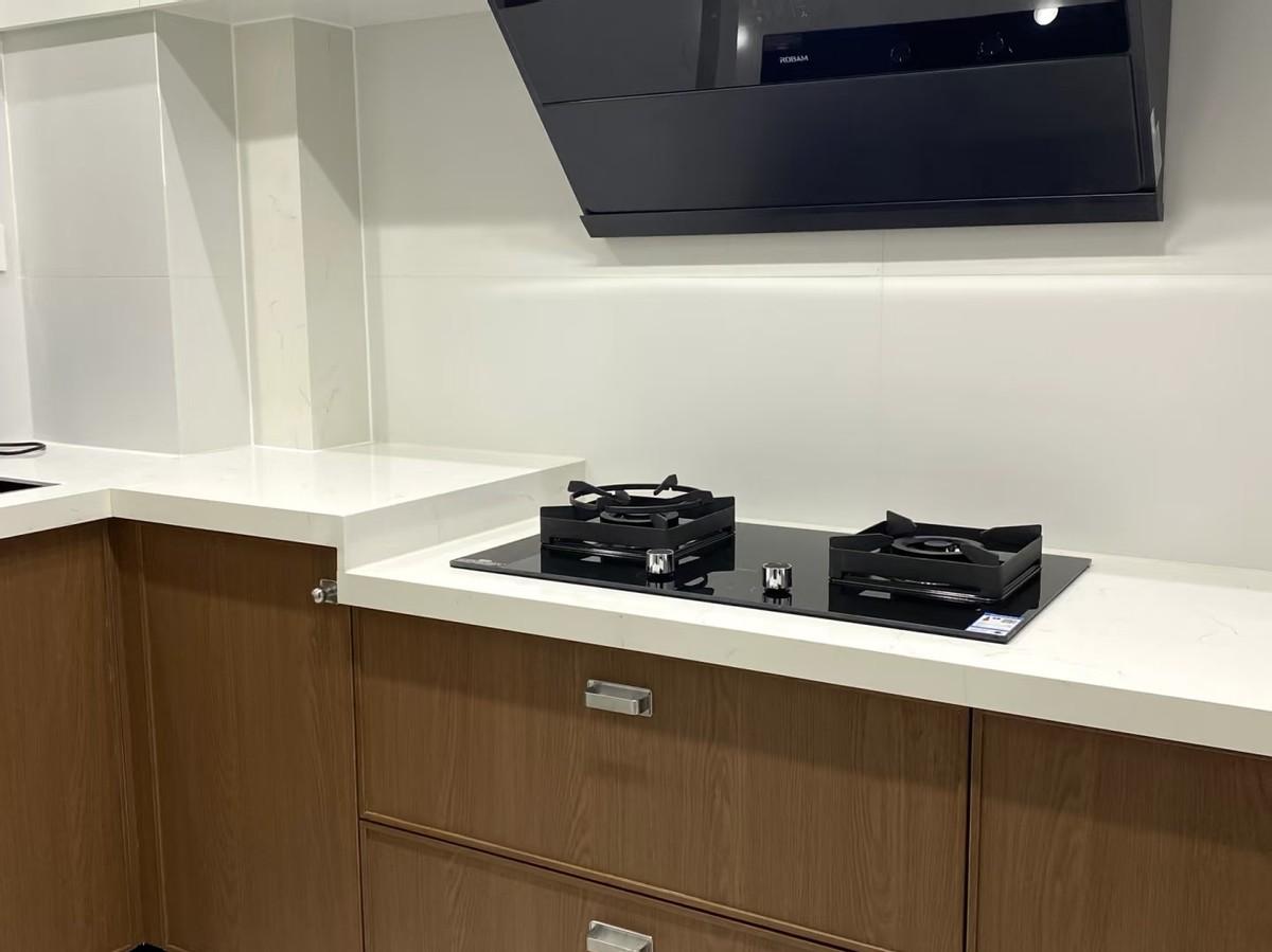 廚房高低臺的高低差,儘量控制在5~15公分之間,而且過度要自然。同時要考慮檯面厚度和櫥櫃匹配的一些細節。