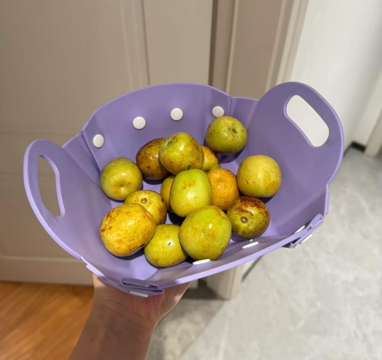 需要的時候,順着摺痕一展一扣,秒變一個大容量的果蔬籃,自帶提手,裝水果、洗蔬菜都方便。