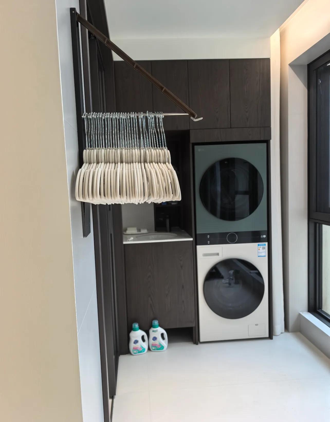 不過嘛,問題不大!我搞了個伸縮衣架,隨便找個平面就能支棱起來,不僅是個補充晾曬點,更是一個專屬的“衣架收納站”。