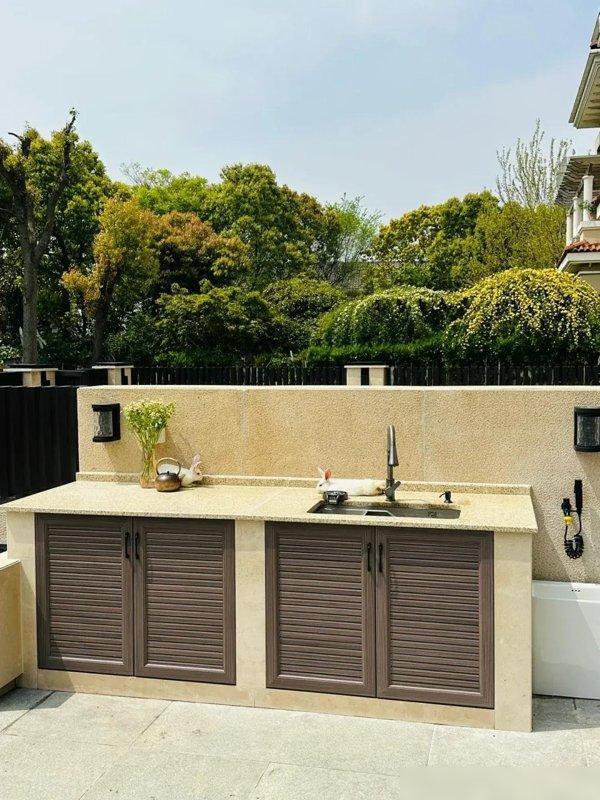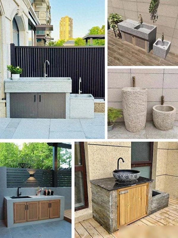 我家院子的洗手檯是去年裝的,親測“好用到哭”:選的是花崗岩一體盆,戶外凍一冬天沒裂,比陶瓷盆抗造10倍;龍頭選了冷熱水雙控,冬天洗手不凍手,夏天衝個桃子涼絲絲的;下面做了個帶百葉門的櫃子,放園藝剪、噴壺、清潔液,平時藏起來看不見,用的時候一拉門就有——你說這是不是把“浪費的空間”變成了“藏起來的方便”?