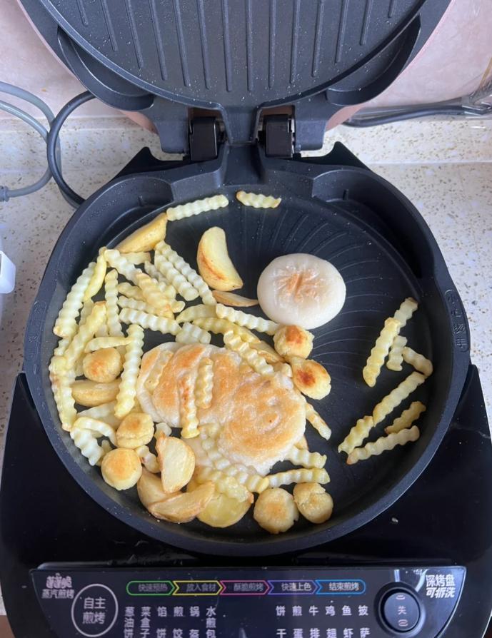 雖然電餅鐺的盤,比較淺。但是有一說一,用它炒一些土豆絲啥的完全可以!烤大蝦、烤魚,更不在話下了!