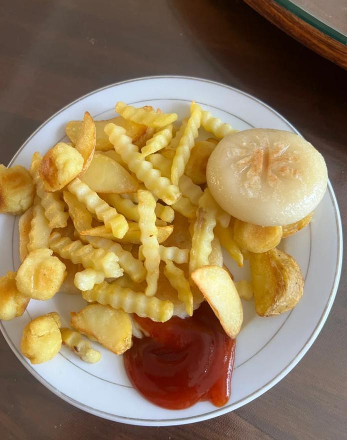 和上面這個凍品的做法原理一樣!超市買點冷凍薯條,直接擱在電餅鐺裏~