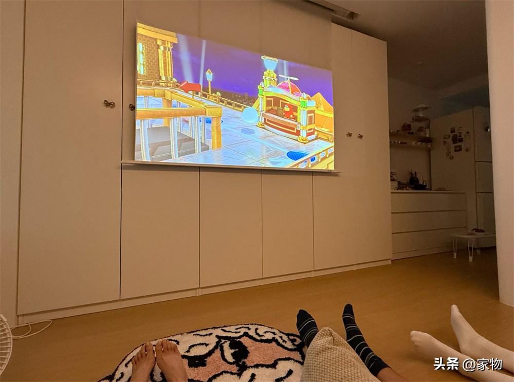 桌子的對面,則是一整面牆的高櫃,當作家中的衣櫃和收納櫃使用,櫃子的頂部安裝了電動幕布,甚至叫家人朋友來作客時,還可以坐在櫃子對面,一起看看電視聊聊天,說起來倒也蠻有趣的。